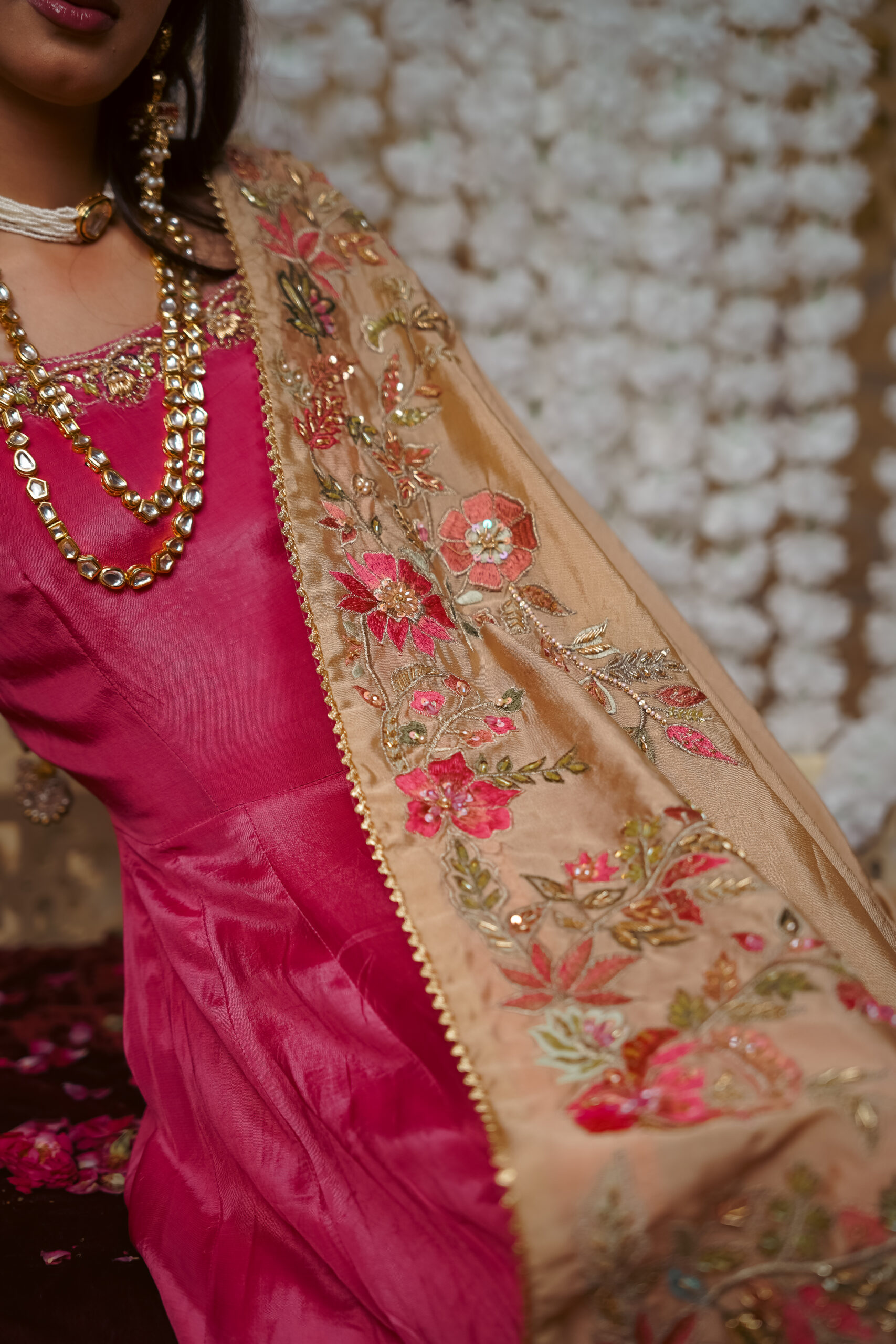 Paired with a luxurious silk shawl, detailed with fine handcrafted artistry.