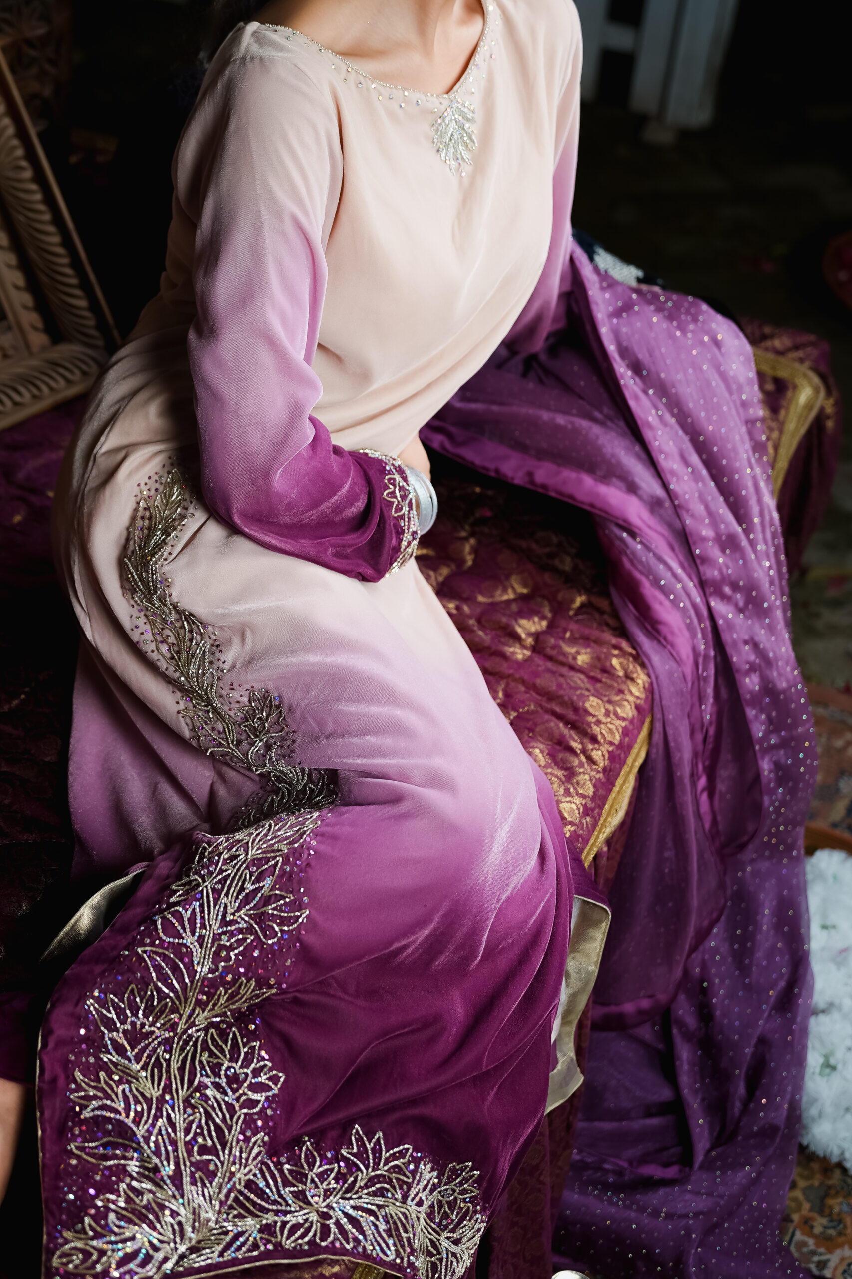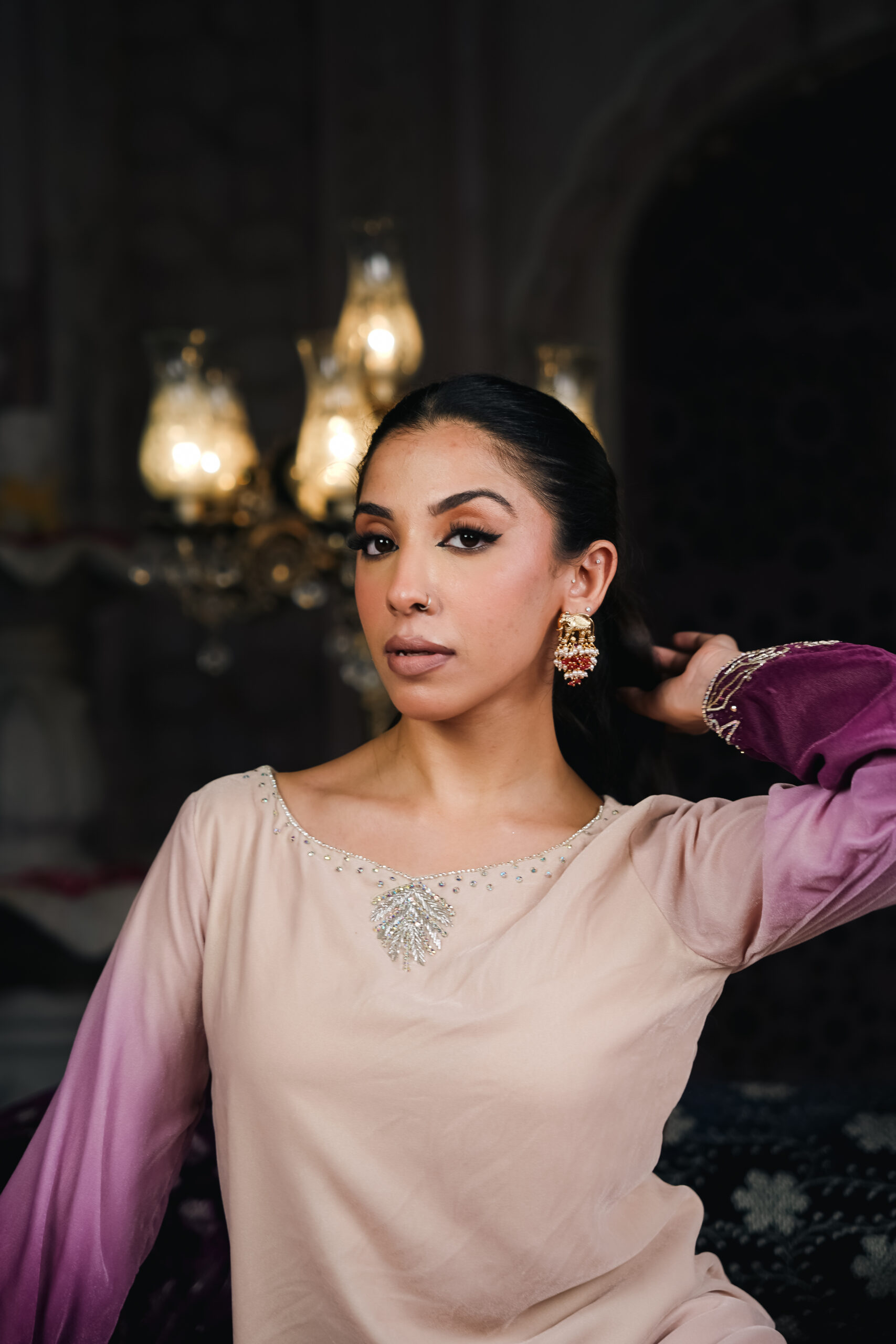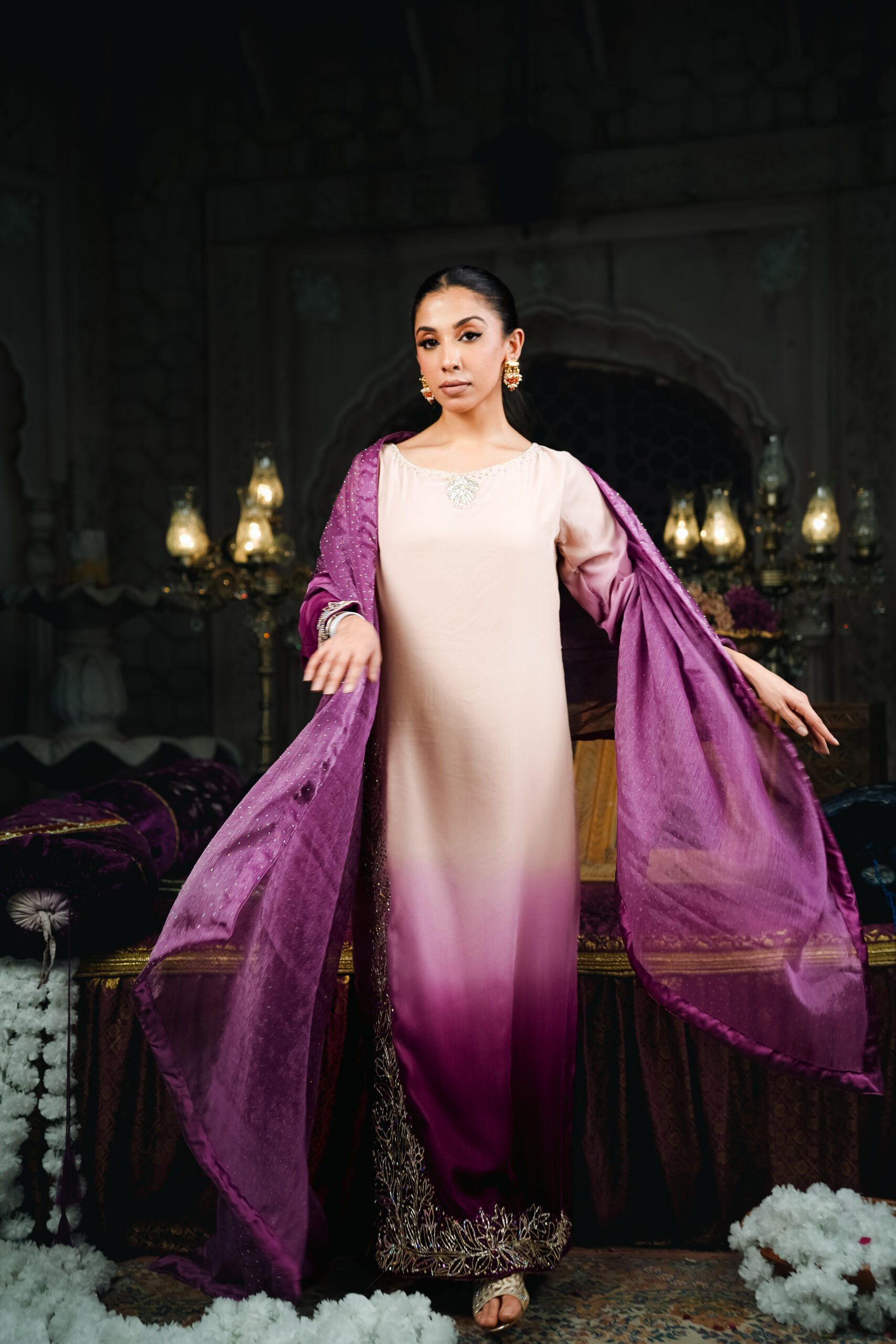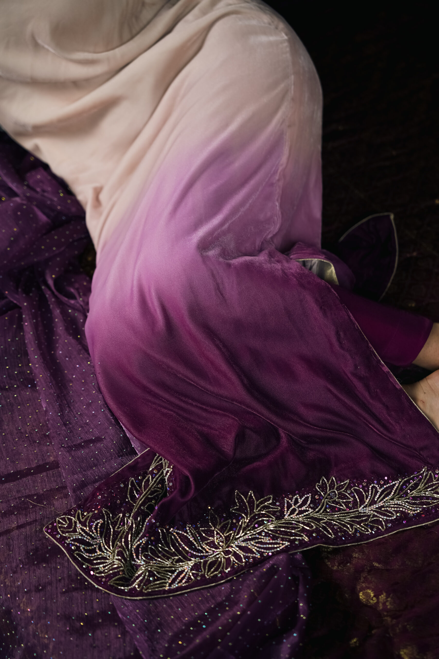 Draped in a soft nude pink that gracefully melts into deep plum, this velvet ensemble exudes regal elegance and timeless charm. The long A-line shirt is adorned with intricate floral and leaf motifs along the borders and side panels, beautifully enhanced with exquisite hand embellishments of naqshi, zardozi, and sparkling stones.